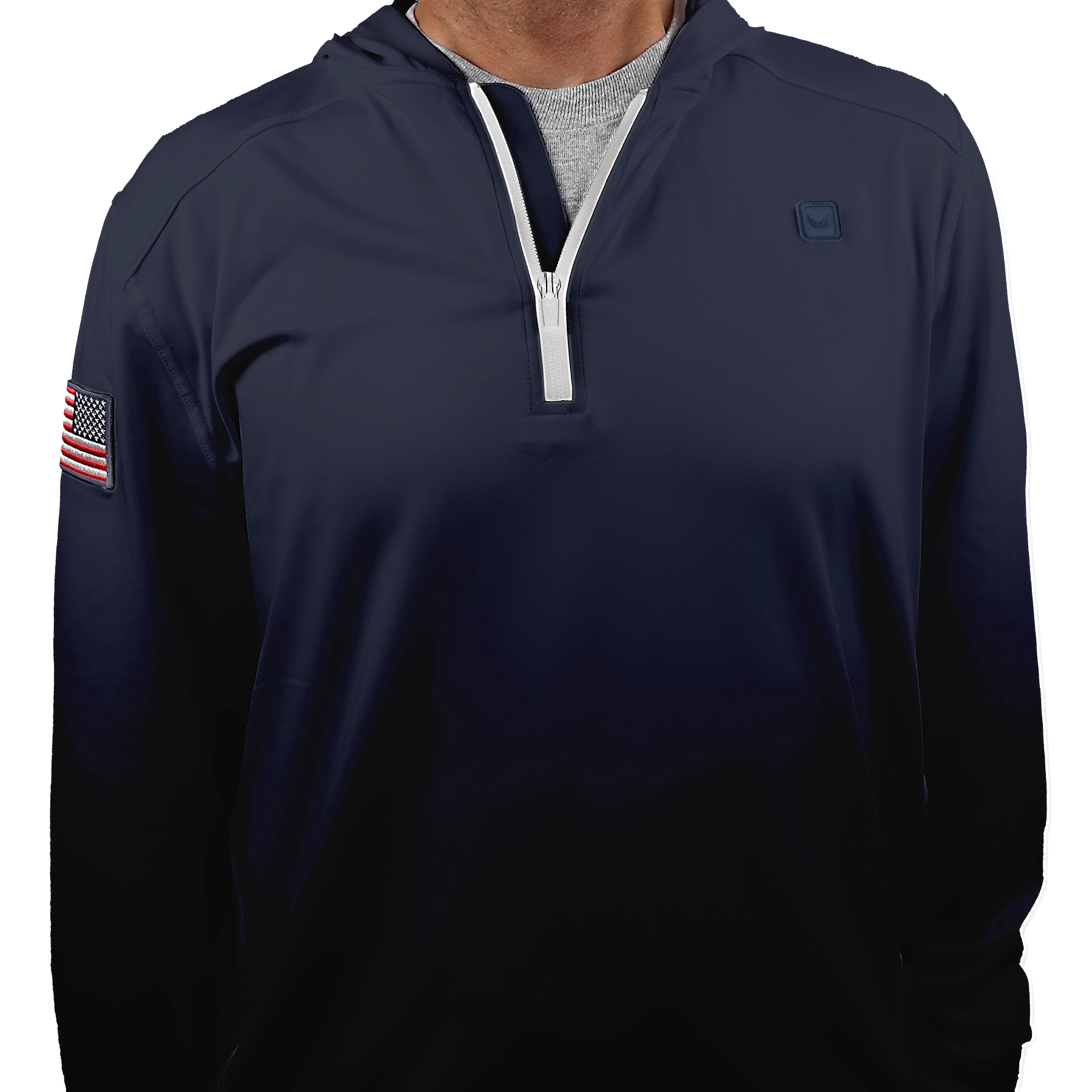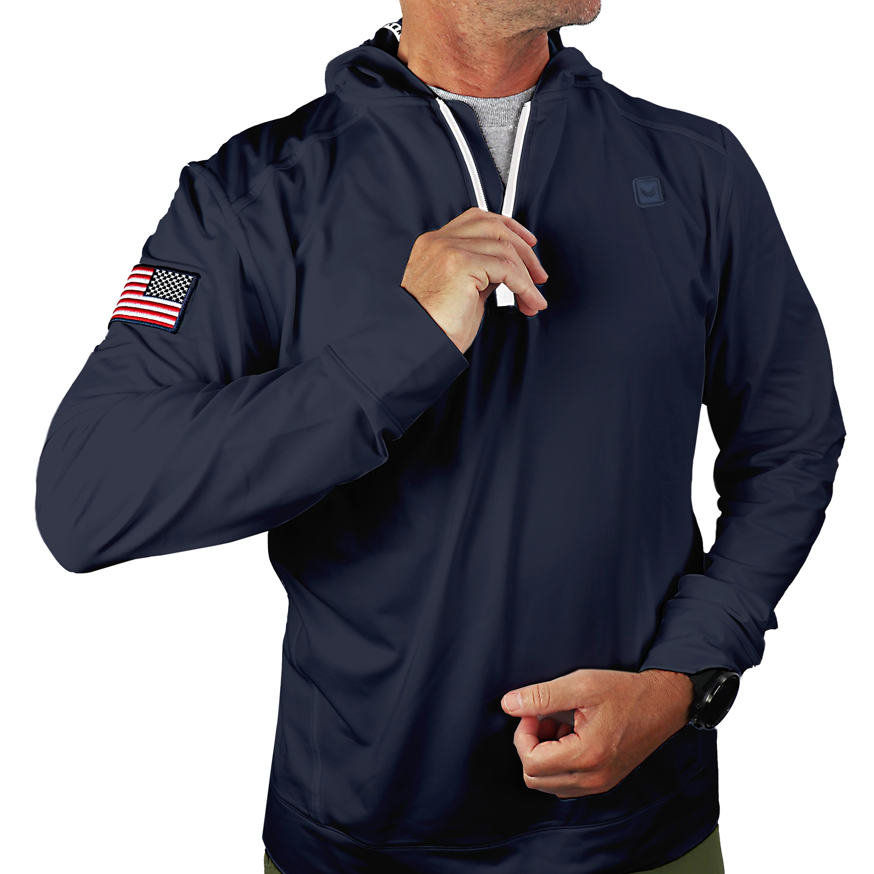 • Patriotic Design: The 1/4 zip design is accentuated by an embroidered American flag on the right sleeve, symbolizing respect, honor, and pride.